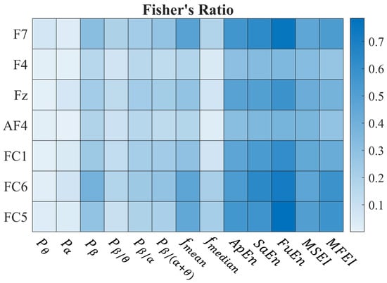 We used Fisher’s Ratio (FR) to identify metrics that exhibit the greatest differentiation between the concentration and rest states (Phase 1). The results are reported in Figure 3 where a heatmap shows the median Fisher’s Ratio for each channel–metric pair across the whole set of subjects. The results show that entropy-based metrics exhibit high FR values for distinguishing relaxed and attentive states across all channels.