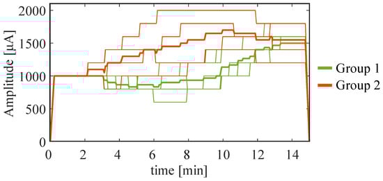 In Phase 3, stimulation parameters were adapted to each participant based on their previously selected channel–metric pairs and responses, utilizing the closed-loop system described in Figure 2C. The temporal profiles of the stimulation current are presented in Figure 5, where the thicker lines represent the average trend in each group. Table 1 provides a comprehensive summary of the adapted stimulation protocols, detailing group, channel–metric pair, stimulation type, and maximum current intensity for each subject during the test.