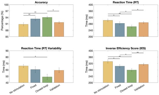 Moreover, taking the overall performances, the closed-loop stimulation allowed increasing the accuracy (94.04%), and reducing the reaction time (262.93 ms) and its variability (49.04 ms), resulting in a smaller Inverse Efficiency Score (279.24 ms; notice that, despite the small dataset, the IES is also statistically smaller from the condition with fixed stimulation).