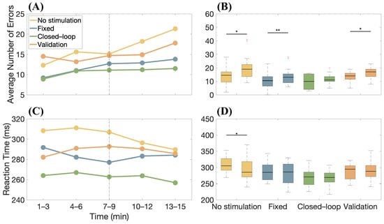 Moreover, the overall trend of errors was assessed over time and the temporal variations in concentration stability across the different study phases are highlighted in Figure 7A, where the average number of errors made by the 10 subjects was calculated at 3-min intervals for each phase. Overall, an increase in errors in the final part of the protocol is observed. Figure 7B shows box-and-whiskers plots relative to the number of errors made by the candidates in different stimulation conditions considering the first and the last six minutes of the task. A Wilcoxon Signed Rank test showed a statistical decrease in performances, documenting the effect of fatigue on concentration during the task, with the exception of the case in which closed-loop stimulation was employed. With the same format as in Figure 7A,B, the variations in the average RT are shown over time in Figure 7C,D, respectively. Despite mental fatigue, RT is approximately constant (with the exception of the first test, for which an increase in the speed of reaction of the subjects is noticeable, as if they were becoming more familiar with it as time passed). We also notice that the participants were always faster (on average) when the adaptive stimulation was used.