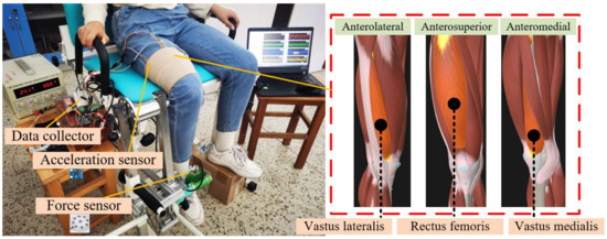 The experimental setup and quadriceps anatomy are illustrated in Figure 1. The signal acquisition equipment and sensor placement referenced pre-work [31]. The subjects were asked to sit comfortably in a test chair with their right leg fixed and bent at a 90° angle.