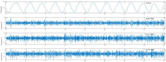 MMG signals can be obtained by accelerometers on the skin surface above the muscle of interest. Such sensors, as elaborated by Harrison, can measure vibration signals created by the contraction of muscle, but they also pick up disturbances such as the movement of the limb as it accelerates, decelerates, is lifted, or lowered [17]. To overcome these issues, we employed the previously designed noise suppression and artifacts removal method [40] to filter out these interferences. Meanwhile, for the knee extension force signals, we designed a 5 Hz third-order Butterworth low-pass filter to filter out high-frequency noise. After signal processing, we obtained a more stable 40 ms signal sequence as experimental data by deleting the 10 ms signal sequence preceding and following the original sequence. Figure 2 shows the filter effect on the original MMG signals and the knee extension force signals during DVIC.