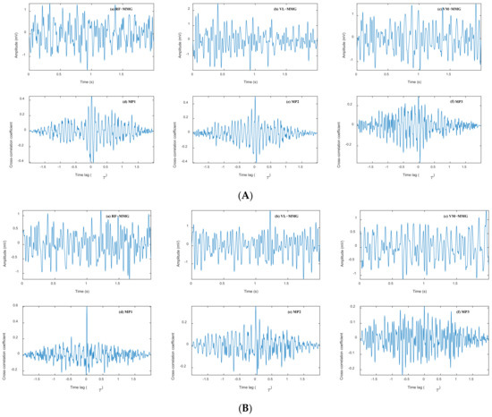 For cross-talk analysis, a 2 s signal segment was extracted from each muscle MMG. Additionally, cross-correlation coefficients were used to quantify cross-talk between different muscle pairs during contracting muscle. The results of the cross-correlation analysis indicate that most of the PCCC was observable at a time lag (τ) of approximately 0 s, which is consistent with the literature [44,45,46]. Figure 4 shows the MMG signals and the correlation diagrams of different muscle pairs during 60% MVIC and DVIC, respectively. As can be seen in Figure 4, MMG signals of all three muscles have cross-talk in the case of SVIC and DVIC, which poses further difficulties in fully identifying different muscle activities.