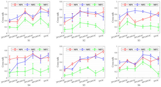 To investigate MMG cross-talk between different muscle pairs, the cross-talk results for six subjects at different levels of SVIC and DVIC are plotted in Figure 5. From the statistical analysis, the range of cross-talk between different muscle pairs was 0.0538–0.7978, which demonstrates that all of these adjacent muscles may contribute to the MMG signals, i.e., all muscles are contaminated by cross-talk.