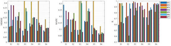 To verify the above hypothesis, the results of knee dynamic extension force estimation for six subjects with different feature combinations is illustrated in Figure 6 and Table 1, respectively. Figure 6 shows the NRMSE, MAPE, and R of the LSTM model on the test sample under different feature combinations for six subjects. From the estimated results for six subjects with different feature combinations in Figure 6, it can be seen that each subject’s feature combination F2 presents optimal results in comparison to the other feature combinations.