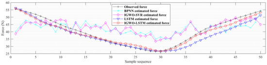 Figure 8 shows the estimation results of different estimation models for subject S3 in the test sample, with the black line showing the observed force sequence, the red line showing the estimated sequence from the IGWO-LSTM model, and the blue line showing the estimated sequence from the LSTM model. In addition, the estimated sequences from BPNN and IGWO-SVR are also plotted in Figure 8. The closer the estimated sequence is to the black line, the higher the accuracy of the model’s estimation. As can be seen in Figure 8, the estimated sequence of the BPNN and IGWO-SVR models are farther away from the observed sequence, indicating poorer estimation results, while the estimated sequence of the IGWO-LSTM model is closest to the observed sequence. These results indicate that the IGWO-LSTM model is far more accurate than any other model, and further demonstrate that the proposed model is more suitable for high-precision knee dynamic extension force estimation.