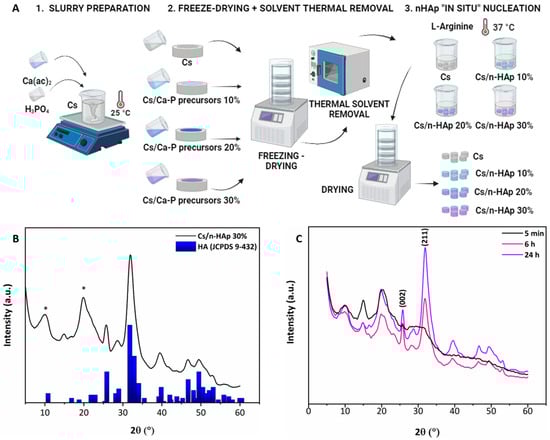 (A) Scheme of Cs/n-HAp composite scaffold preparation. (B) XRD pattern of Cs/n-HAp 30% compared with reference HA powder (JCPDS 9-432). Asterisk (*) refers to Cs diffraction maxima. Since Cs is a semi-crystalline material, a broad diffraction peak at about 2θ ≈ 20° was detected. (C) XRD patterns of Cs/n-HAp 30% obtained from Cs/Ca-P precursor 30 at three different soaking times (5 min, 6 h, and 24 h). The Miller indices of two diffraction peaks characteristic of HA are shown (002), (211). Asterisk (*) refers to Cs diffraction maxima.
