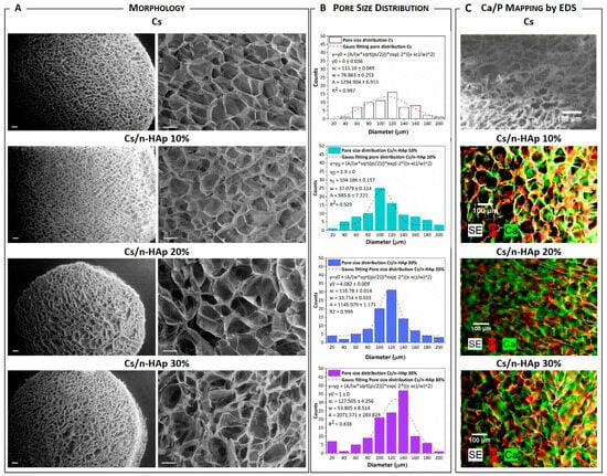 (A) SEM micrographs of pure Cs and Cs/n-Hap composite scaffolds’ transverse sections [left side: mag. 60×, scale bar 200 µm; right side: mag. 300×, scale bar 100 µm). (B) Pore size distribution analysis of pure Cs and Cs/n-Hap composite scaffolds. (C) Calcium (Ca) and phosphorus (P) mapping by EDS analysis of pure Cs and Cs/n-Hap composite scaffolds’ transverse sections (Mag. 150×; scale bar 100 μm).