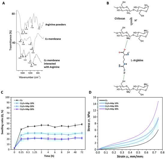(A) FTIR spectra of L-arginine powder, pure Cs membrane, and Cs membrane interacted with L-arginine. (B) Representation of the chemical interaction between chitosan and L-arginine. (C) Swelling ratio (expressed as percentage) of pure Cs scaffold and composites Cs/n-HAp 10%, Cs/n-HAp 20%, and Cs/n-HAp 30%. (D) Stress–strain compression curves of pure Cs scaffold and composites Cs/n-HAp 10%, Cs/n-HAp 20%, and Cs/n-HAp 30%.