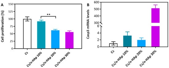 (A) MTT proliferation assay of NIH-3T3 cells cultured on pure Cs scaffold and composite scaffolds (Cs/n-HAp 10%, Cs/n-HAp 20%, and Cs/n-HAp 30%) after 48 h of cell seeding. Data are expressed as mean percentage ± SEM (n = 3). The cell proliferation on the pure Cs scaffold has been normalized to 100% (control). Statistical analysis was conducted with the Student’s t-test (** p <0.01), and the difference between the other groups is not significant. (B) Transcriptional regulation of Casp-3 gene in NIH-3T3 cells grown for 72 h on Cs and composite scaffolds. Quantitative expression analysis by real-time RT-PCR. Expression of the identified target mRNA is represented as the 2−ΔCt function value, obtained from amplification data (Ct, threshold cycle), normalized by 28S RNA values (internal control for calibration). The 2−ΔCt values are relative to the control mean value (Cs = 1) and are expressed as fold-change on the y-axis in the graphic. Mean values (±S.E.M.) are derived from n = 3 independent assays.