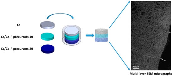 Scheme for the Cs and Cs/precursor assembly mode and SEM image of the obtained multilayer graded structure. Arrows highlight the border line between layers with increasing n-HAp loading.