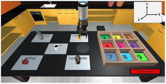 The scene also includes objects that are manipulated by the user by commanding the robotic arm (Figure 3). These objects are a bottle, a croissant, a cup, an apple, and a fizzy drink; these have been chosen because they are common elements in a kitchen and familiar to the users. All objects are affected by gravity and collide with other objects (including the gripper) when they are in contact. Thus, the robot is able to grasp them in a realistic way. The objects to be moved are surrounded by a green rectangular prism which corresponds to a Box Collider. This element allows the robot to collide with the object and grip it, this box shape makes gripping easier. All objects are assumed rigid to avoid gripping issues, as the goal is to test myoelectric control but not realistic physics.