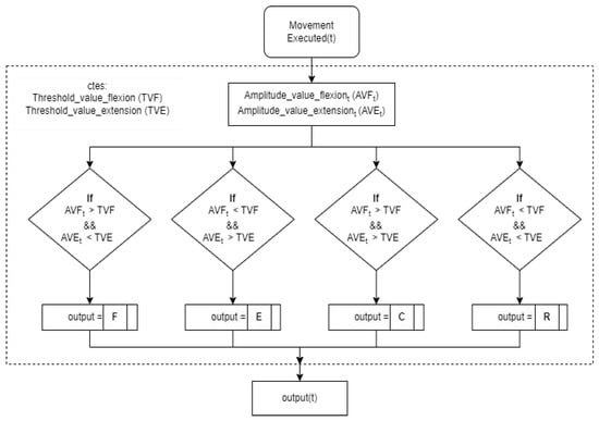 In this application a mixed myoelectric control approach between ON/OFF control and a state machine is used. The ON/OFF control mode (Figure 5) is used to classify which type of movement is being detected by the user (flexion, extension, co-contraction or rest). Two thresholds are defined, one for extension and one for flexion movement (TVF and TVE). When the amplitude of the user’s EMG signal ( and ) exceeds one of these thresholds, flexion or extension movement is detected. If both thresholds are exceeded, a co-contraction movement is detected. The state machine, which depends on the classification of movements by the ON/OFF control mode () mentioned above, is used to define the robot’s states as well as the transition between them. The thresholds that are established for the ON/OFF control mode are customised for each user. To have a more intuitive interaction, flexion movements are related to movements in the negative axis of the robot and extension movements to the positive axis of the robot. The co-contraction movements allow the transition between the states of the state machine. Each mode deals with the muscular inputs in a different way.