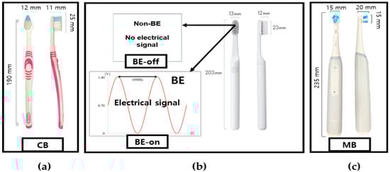 Actual figure of tested toothbrushes. (a) Conventional manual toothbrush (CB). (b) Proposed BE toothbrushes (applied non-BE: BE-off, applied BE: BE-on). (c) Electric–mechanical toothbrush, Oral-B iO3, (MB).
