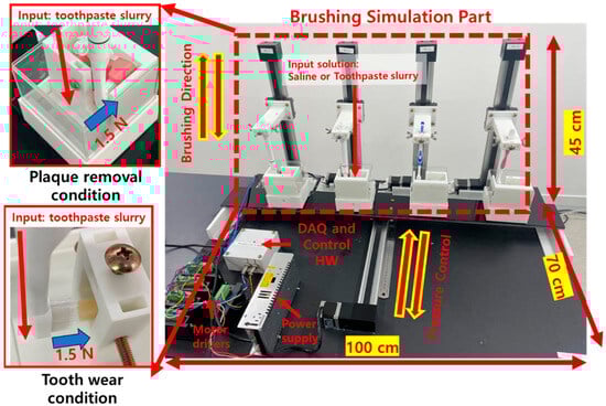 In this study, we aimed to perform a quantitative investigation of the plaque-removal efficiency and surface wear effect focused on the BE toothbrush and electric–mechanical toothbrushes, which have high plaque-removal efficiency but are disadvantaged in terms of tooth wear. Analysis of the material wear due to the surface friction of movement in toothbrush requires precision control of brush parameters, including applied pressure, brushing direction, and repetition, along with measurement of tooth wear. These are not adaptable parameters for human-involved testing. Clinical trials are not appropriate for quantitative evaluation owing to inter-individual variability and the difficulty of monitoring; however, in vitro simulators have been used to increase the reproducibility of the experiments, including toothbrush efficacy studies [,,,]. The simulator was integrated with a precise displacement controller, corresponding to the applied pressure of the toothbrush on tooth-mimicked material. It selected polymethyl methacrylate (PMMA) for use as a simulated tooth based on previous literature []. The brushing direction and repetitions are set by the linear actuator and step motors of the simulator []. The thickness measurement of the PMMA wear was conducted using a micrometer with three repetitions. The simulator demonstrated excellent correlation with standard pressure sensors and displacement []. We conducted four types of toothbrush testing conditions (Control: conventional toothbrushes, Negative Control: developmental toothbrushes without the BE, Experimental Group: with the BE, and Experimental group: electric–mechanical toothbrushes) using the in vitro toothbrush simulator. We used Streptococcus mutan-based plaque incubated in a growth medium as the standard model of oral biofilms []. Based on the experimental results, we investigated the degree of plaque removal and surface wear effect of the BE toothbrush in comparison to the traditional electric–mechanical device.