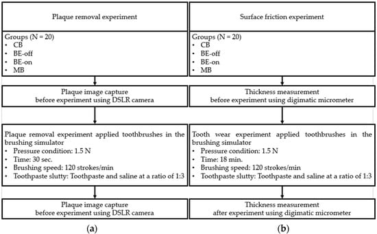 Graphic description of the plaque removal and tooth wear procedure: (a) plaque removal experiment (N = 20). (b) Wear experiment (N = 20).
