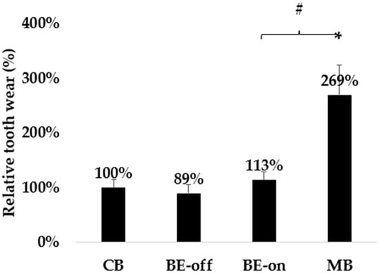 Results of relative wear in wear experiment showing significant relative wear under only MB (N = 5 in each condition). Results are presented as means ± SDs. * p < 0.05 versus CB. # p < 0.05 versus BE-on.