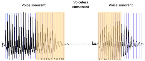 where is the fundamental frequency and is the fundamental frequency of the reference cycle, which is considered the most stable, that is, the one of the cycle farthest from the voiceless consonant (for the offset cycles, the first one, and for the onset cycles, the tenth one) (Table 1).