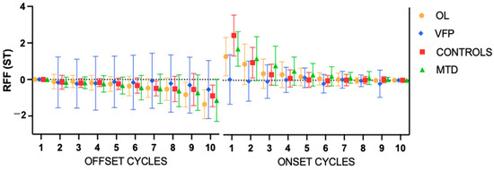 Mean values of the relative fundamental frequency (RFF) for each group. Error bars show the standard error. ST = semitones; OL: organic lesions; VFP: vocal fold paralysis; MTD: muscle tension dysphonia.