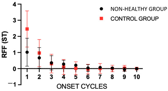 Comparing the control group with the rest of the non-healthy groups (Figure 3), in the two-way ANOVA for onset cycles, statistically significant effects were found for the groups (p < 0.001), cycles (p < 0.001), and the interaction (p < 0.001). Using the Šídák’s multiple comparisons test, statistically significant differences (<0.0001) were found between cycles 1 and 2 of both groups, with a difference of −1.440 ST (−1.727 to −1.153) for cycle 1.