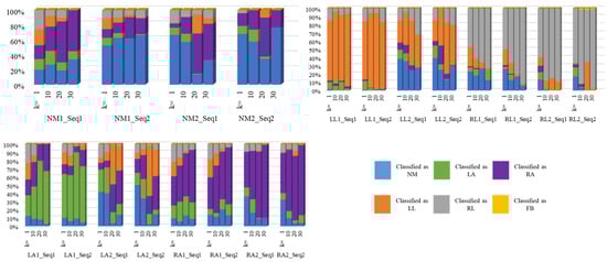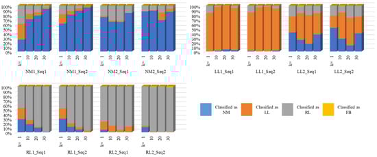 | A part of an NM sequence; white, red, and green corresponds to NM, LL, and RL predictions, respectively. n = 4, k = 1. | ![]() |