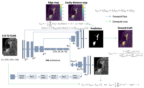 - Myronenko, A. 3D MRI brain tumor segmentation using autoencoder regularization. In Brainlesion: Glioma, Multiple Sclerosis, Stroke and Traumatic Brain Injuries, Proceedings of the 4th International Workshop, BrainLes 2018, Held in Conjunction with MICCAI 2018, Granada, Spain, 16 September 2018; Revised Selected Papers, Part II; Springer: Berlin/Heidelberg, Germany, 2019; pp. 311–320. [Google Scholar]