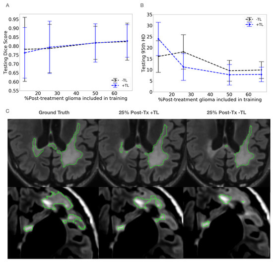- Ghaffari, M.; Samarasinghe, G.; Jameson, M.; Aly, F.; Holloway, L.; Chlap, P.; Koh, E.; Sowmya, A.; Oliver, R. Automated post-operative brain tumour segmentation: A deep learning model based on transfer learning from pre-operative images. Magn. Reson. Imaging 2022, 86, 28–36. [Google Scholar] [CrossRef]