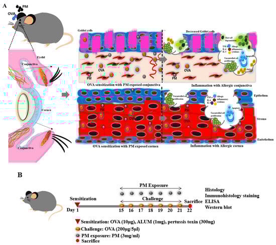 Considering the prevailing conditions and the potential influence of PM exposure on the exacerbation of respiratory allergic diseases, our hypothesis posits that the co-exposure to PM along with OVA may similarly amplify the symptoms associated with AED, as it mimics allergic reactions in human ocular surfaces. To validate our hypothesis, in this study, we established an OVA-induced with PM exposed AED mouse model with the standard reference material (SRM 2786, mean diameter <4 μm) of PM powder containing organic/inorganic constituents. The particle-size characteristics of this PM powder align with those of atmospheric particulate materials and comparable matrices, differing somewhat from the finer PM utilized in the majority of prior studies [,]. This study aimed to explore the possible adjuvant activity of ambient fine PM in triggering immune responses and inflammation and thereby contributes to allergic sensitization in a mouse model of AED (Figure 1A) simulating a human ocular surface, in conjunction with OVA.