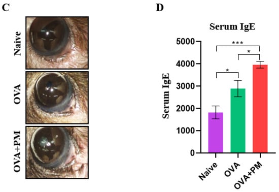 Subsequently, to compare the allergic response among the groups, the ELISA for the OVA-specific IgE in the serum collected from the mouse was performed. Several studies demonstrated that IgE played a major role in ocular allergic diseases [,,]. From our study, compared to the OVA and OVA + PM exposed group, the OVA specific IgE level in the naive group was relatively lower. This showed that the OVA-mediated IgE allergic responses were predominantly raised in the OVA + PM exposed group with allergic symptoms (Figure 1D).