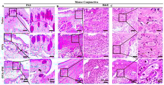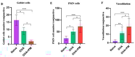 Similarly, the hemagiectasis was determined using H&E staining in the conjunctival tissue in our AED mouse model. Prior research demonstrated that exposure to PM in animal models can lead to vascular dilation, which may suggest an acute inflammatory response. This underscores the connection between the inflammation and allergic reactions on the ocular surface [,]. In our findings, it was revealed that hemagiectasis significantly increased in the OVA + PM exposed group compared to the naive group. Subsequently, a similar increase was observed in the OVA group relative to the naive group. (Figure 2C,F).