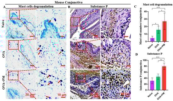 In our study, a significant number of mast cell degranulation was observed in OVA + PM exposed and OVA groups. Interestingly, in the naive group, the mast cell degranulation was relatively lower than in the other groups (Figure 3A,C). Similar to our study, the excessive mast cell degranulation was also observed in the mouse model of AC induced by PM [].