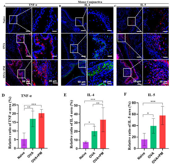Our study revealed an upregulation in the expression of TNF-α, IL-4, and IL-5 in the OVA + PM exposed group, contrasting significantly with lower expressions observed in the naive group in the conjunctival tissue. Additionally, the expressions in the OVA group closely resembled those in the OVA + PM exposed group (Figure 4A–F). Previous studies align with our findings, demonstrating that the topical administration of PM on the ocular surface increases the expression of TNF-α, IL-4, and IL-5 in ocular allergy models [,].