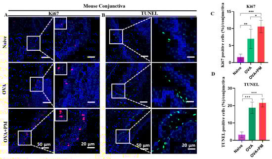The immunofluorescence staining targeting Ki67, a marker for uncontrolled cell proliferation indicative of actively dividing cells, was employed to assess conjunctival and corneal tissue in our AED mouse model. Our investigation revealed a dramatically increased number of Ki67-positive cells in both OVA + PM exposed and OVA groups. Interestingly, this count remained relatively minimal in the naive group. Ki67-positive cells predominantly localized in the basal cell layer of the conjunctival epithelium (Figure 5A,C) and corneal epithelium (Supplementary Figure S2A,C).