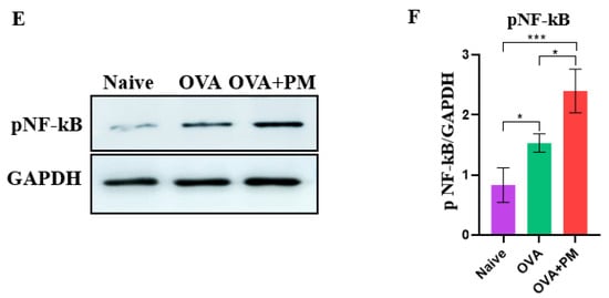 Furthermore, a Western blot analysis of p NF-κB was conducted to quantify the protein levels associated with inflammatory responses from the conjunctival tissue in our AED mouse model. Our results revealed heightened protein expression in the OVA + PM exposed groups compared to the naive group. Likewise, the protein expression in the OVA group closely mirrored those observed in the OVA + PM exposed group (Figure 5E,F). Similar findings with an upregulation of allergic inflammatory cytokine levels in the PM-exposed group were observed in the mouse allergic model [,,].
