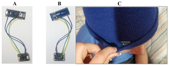 Figure 3, the CMS is a wearable soft fabric cap or “beanie” made of wool. Caps were neurostimulation shams fashioned in either of three colors: red (Pantone 200C ≈ AF060E/RGB: 175,6,14), blue (Pantone 7687C ≈ 263B83/RGB: 38,59,131), or gray (Pantone 424C ≈ 6D6D6B/RGB: 109,109,107). A small opening was cut on the inside layer of the fold to allow the ToF sensor to detect the distance from patient’s forehead. This opening was then made into a window, using clear transparent polyvinyl chloride (PVC) plastic sheet to create a comfort barrier between the patient’s skin and the ToF sensor. The 10 mm long (1.5 kΩ) DelR Flex sensor was similarly installed and secured within the fold of the beanie such that the sensor experienced a stretching force and corresponding strain (set to 10%) during donning and which force was relieved during doffing, producing a change of 150 Ω. In one approach, the ToF or DelR sensor was used to initiate and terminate data collection. In a second approach, data collection was initiated only when both sensors were activated.