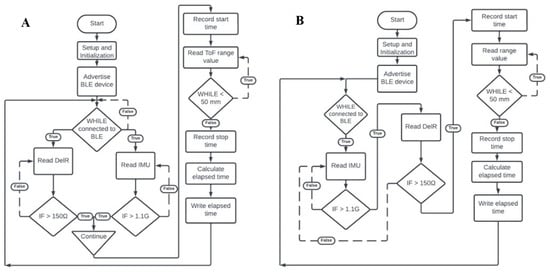 Figure 4B, once a connection is initiated by a central BLE device, the Arduino board begins reading accelerometry data from the board’s IMU. If movement greater than 1.1 g-force units (g) in any direction is detected, then the DelR Flex Sensor is read to confirm donning of the device due to stretching in excess of 10% strain. If a resistance change of 150 Ω or greater is detected then the start time is recorded. In both algorithms, after the start time is recorded, the ToF sensor begins continuously reading range values. It continues to read range values until a range value of 50 mm or above is reached, indicating that the device has been removed from the head. The threshold of 50 mm was determined based on experimental use and ensures that the loop only breaks when the device is removed from the head and not when it is adjusted for fit or position. Once this threshold is reached, the device stops reading range values and records the stop time. The elapsed time is then calculated by subtracting the start time from the end time, and then the elapsed time (in milliseconds) is written to the connected central BLE device. This process can repeat as many times as a large movement is detected while still connected to the central BLE device, ensuring that if multiple sessions occur in sequence, they will all be detected separately and accurately.