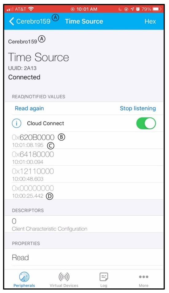 ®. For this application, the mobile device acts exclusively as a central BLE device, while an Arduino board acts exclusively as a peripheral BLE device. The transmitted data was received through use of a commercially available iOS app, the LightBlue