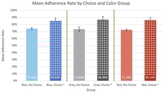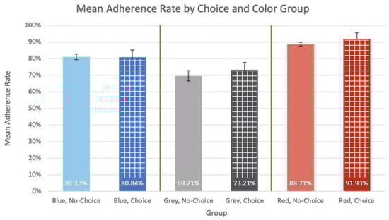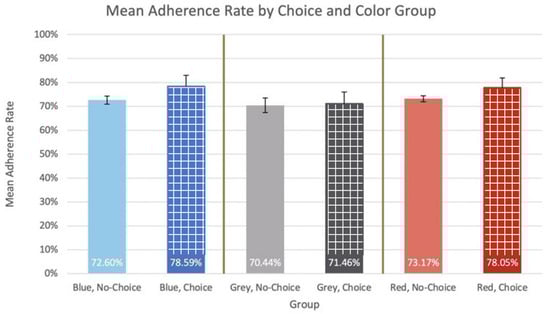 The ANOVA resulted in p-values of 0.36 and 5.25 × 10−8 for choice and color as sources of variation, respectively. Because the p-value for choice as a source of variation was greater than α = 0.05, the ANOVA null hypothesis failed to be rejected and this was found not to be a statistically significant source of variation in the adherence rate data. Because the p-value for color as a source of variation was less than α = 0.05, the ANOVA null hypothesis was rejected, and this was found to be a statistically significant source of variation in the adherence rate data. Because choice was found to be a statistically significant source of variation in adherence rates in Model 3, an unpaired two-sided student’s t-test was conducted between the choice and no-choice groups. This testing revealed p-values of 2.21 × 10−3, 9.46 × 10−10, and 3.46 × 10−3 for blue/grey, blue/red, and grey/red groups, respectively. Because the p-values of each of these t-tests were less than α = 0.05, the t-test null hypothesis was rejected for each pairwise combination, and they were all found to be statistically significant differences. Power analysis was conducted to elucidate the number of participants that would be needed per group to draw conclusions with at least 80% power. The power analysis yielded n values of 8(7.42), 10(9.76), and 9(8.03) for blue/grey, blue/red, and grey/red groups, respectively. These values indicate that at least ten participants per group (blue, grey, and red) are needed for the data to be properly powered.