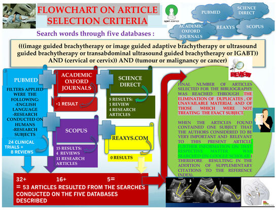 After a previous initial search, we have updated our data by performing a more recent literature search (on 2 May 2024) on five different databases, as follows. (a) Search one was performed on www.Pubmed.gov (accessed on 2 May 2024) and retrieved 32 results after using the following as filters: English language, research conducted on humans, patients’ age between 19 years and >80. The 32 results consisted of 24 clinical trials and 8 reviews. (b) Search two was performed on www.scopus.com and returned 15 results, out of which 4 were reviews and 11 were articles, and the search on this site was limited to English language and to publications that were Journals. (c) Search three was conducted on www.sciencedirect.com and returned five results (one review article and four research articles). (d) Search four was conducted on www.academic.oup.com and retrieved only one result. (e) A fifth literature search was performed on www.reaxys.com and did not have any findings. On all five databases, the search terms were the same (as can be seen in Figure 5), consisting of the following: (((image guided brachytherapy or image guided adaptive brachytherapy or ultrasound guided brachytherapy or transabdominal ultrasound guided brachytherapy or IGABT)) AND (cervical or cervix)) AND (tumour or malignancy or cancer). The final number of articles included in the bibliography was determined by eliminating duplicates, unavailable material, and articles that did not address the exact subject.