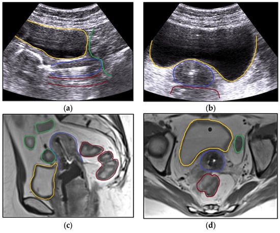 A clinical situation when the Fletcher applicator was used. Sagittal (a) and axial (b) view with the applicator in the uterine canal on transabdominal ultrasound and sagittal (c) and axial (d) pelvic MRI. The fundamental principles pertaining to the implantation of intracavitary brachytherapy are shown. Measuring the uterine canal and taking precautions to prevent perforation is advantageous, particularly when considering the organs that are vulnerable (a,b). MRI pictures provide a clearer identification of the relationship between the organs at risk (c,d). Organs at risk are the bladder (yellow), rectum (brown), and bowel (green). During brachytherapy insertion, the bladder is filled with 400 mL of saline to bring the uterus (blue) into a vertical position (a,b), while with MRI, the bladder is filled with 50 mL of saline (c,d). The applicator is fixed using vaginal gauze packing.
