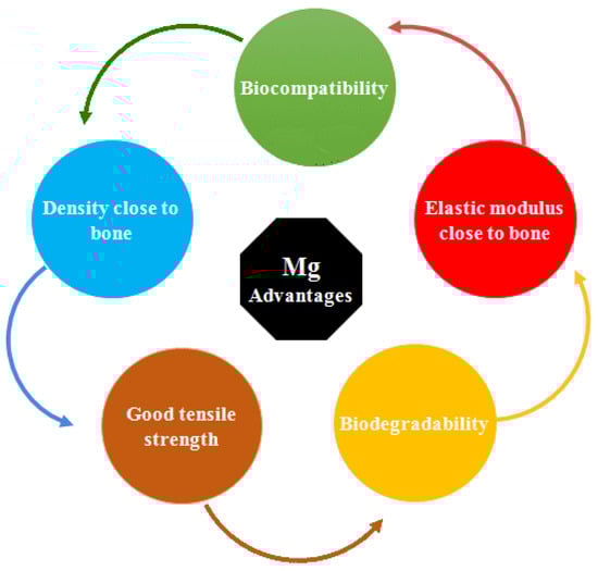 Typically, metals such as platinum (Pt), titanium alloys, and stainless steels, which are also compatible with the body, are used as implants in orthopedic surgery [2,3,4,5,6,7,8]. Secondary surgery to remove the implant, which causes physical and mental pain for the patient, as well as the phenomenon of stress shielding on the tissue surrounding the implant, was always a challenge for researchers [9,10]. But the new generation of implants is biodegradable: as tissues heal, the biodegradable material dissolves and forms a harmless oxide, which is excreted in urine. The group of biodegradable metals includes Mg, zinc (Zn), and iron (Fe) [11]. A summarized quantitative comparison of some physical and mechanical properties of common biodegradable metals, in addition to the characteristics of natural bone tissues, is given in Table 1.
