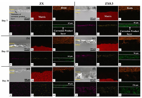 Cross-sectional SEM and EDS micrographs after vitro immersion tests: (a–c) ZX after 7, 15, and 30 days of immersion; (d–f) ZX0.3 after 7, 15, and 30 days of immersion [67].