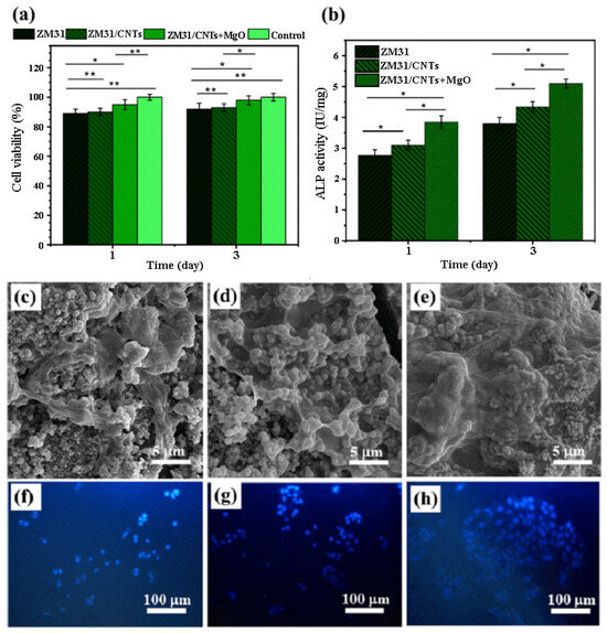 (a) Cell viability and (b) ALP activity of MG-63 cells cultured for various amounts of time on ZM31 alloys, ZM31/CNTs, and MgO-ZM31/CNT nanocomposites, and SEM images of the morphology and adhesion of these MG-63 cells and fluorescent DAPI staining of these cells grown on (c,f) ZM31 alloy, (d,g) ZM31/CNTs and (e,h) ZM31/MgO-CNT nanocomposites for 3 days (* p < 0.05 and ** p < 0.01) [90].