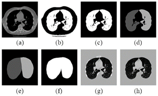 Segment the lung image after a series of preprocessing: (a) convert the source image into HU value; (b) binarize the image; (c) remove non-lung areas; (d) find the left and right distribution of the right lung; (e,f) expanded lung area; (g) HU converted to UINT8 after multiplication; and (h) bone part removed.