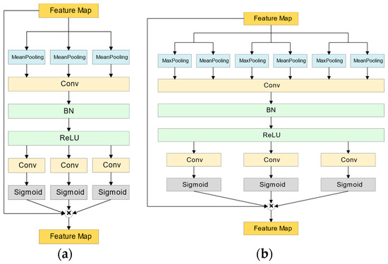 In this section, we introduce a modified version of the coordinate attention architecture, denoted as the type II coordinate attention model (CA-II). To implement structural changes in the Coordinate Attention model, we drew inspiration from the CBAM (convolutional block attention module) method proposed by Woo et al. [28]. The adapted structure is depicted in Figure 4b. Unlike the SENet and coordinate attention models mentioned earlier, CBAM alters the pooling stage by combining global average and maximum pooling simultaneously. Subsequent processing is conducted after extracting features from both channels. Woo et al. explained that this combination allows the integration of spatial information and the capture of global average features with global average pooling, as well as the identification of salient features of specific targets with maximum pooling. This approach results in a richer feature representation. By globally assessing the features across different channels and determining the significance of each channel, the model can assign more attention to the most vital feature channels. In this study, we replaced the pooling process in the coordinate attention model with the pooling method from CBAM to evaluate its potential for achieving better results.