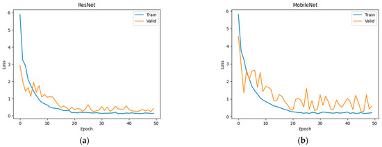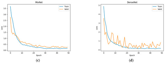 The loss curves during training (blue) and validation (orange) of (a) ResNet, (b) MobileNet, (c) MixNet, and (d) DenseNet in combination with fuzzy c-means clustering.