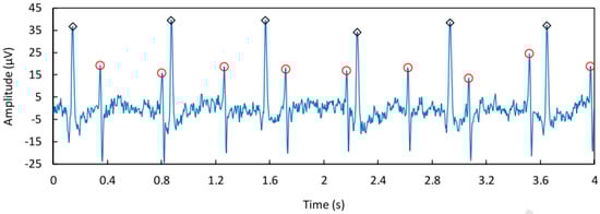 Figure 3. The figure shows an electrocardiogram of a pregnant woman. The red symbols indicate the QRS of the fetus; the black symbols indicate the QRS of the mother.
