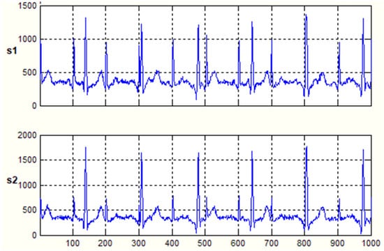 The data used to validate this method were extracted from the FECGSYNDB database [28,29,30], a reliable source for testing fetal ECG extraction algorithms. The FECGSYNDB database contains ECG recordings from a pregnant woman using two electrodes: one placed on the abdomen and the other on the chest. The sampling duration is four seconds at a sampling frequency of 250 Hz, resulting in a signal of 1000 samples. The database utilized for the algorithm is presented in Figure 5. As seen in the samples, the data contain six beats of maternal ECG (mECG) and eleven beats of fetal ECG (fECG), where the mECG has a much higher amplitude than the fECG.