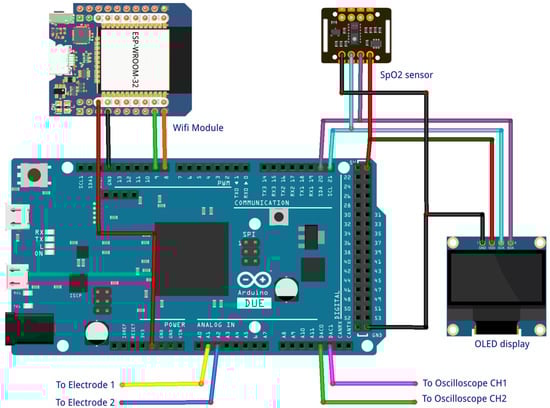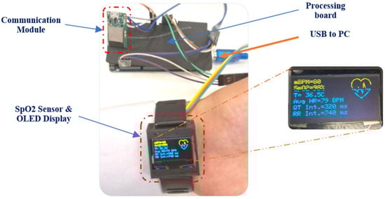 Figure 8 shows the architecture of the system developed in our laboratory, with a wristband integrated with a SpO2 sensor and an OLED screen, which is elegantly housed in a 3D-printed watch case. This portable system is complemented by modules dedicated to data acquisition and transmission. The communication module facilitates connectivity to Wi-Fi networks, enabling the real-time transmission of the acquired data to a designated web server. Users can easily access these data via a dedicated mobile application, improving the monitoring and management of vital health parameters.