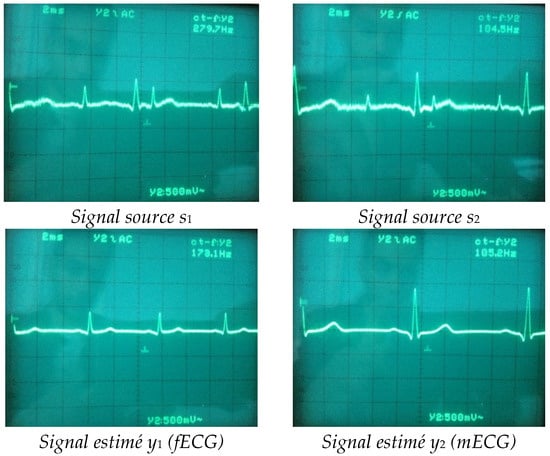 On the OLED display connected to the electronic board, it can be seen that the separation algorithm is SYM-WHITE [32,33] with a performance index [20] of 0.0012. The results of actual implementation demonstrate superior performance in extracting fECG and mECG signals without the need for a computer or separation software.
